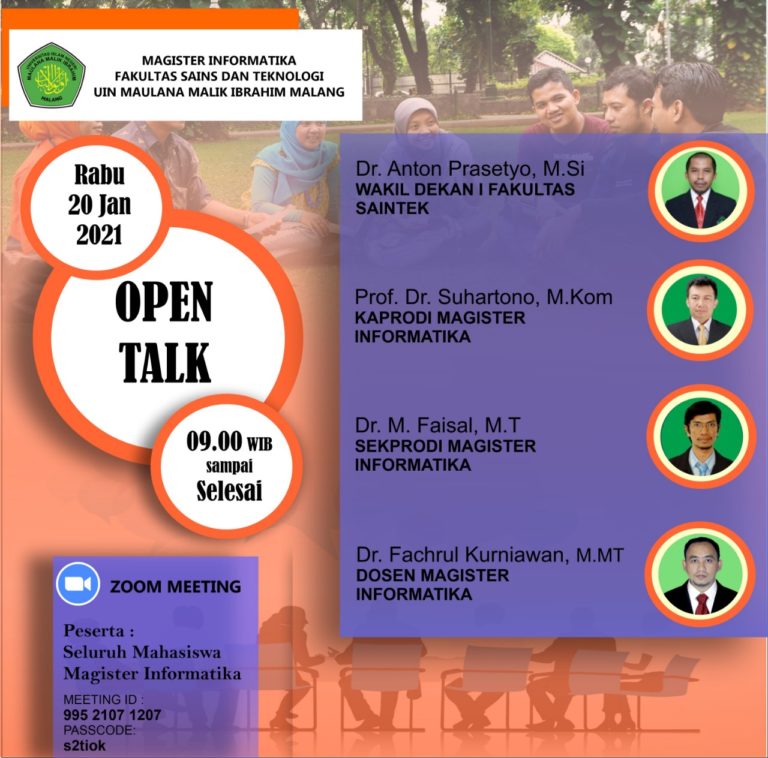 Diharapkan kehadirannya via Zoom Meeting untuk seluruh Mahasiswa Magister Informatika Fakultas Sains dan Teknologi Universitas Islam Negeri Maulana Malik Ibrahim Malang di acara OPEN TALK bersama Wakil Dekan I Fakultas Saintek, Ketua Program Studi, Sekretaris Program Studi, dan Dosen Magister Informatika dengan tema “Studi dan Setelah Studi di Magister Informatika”