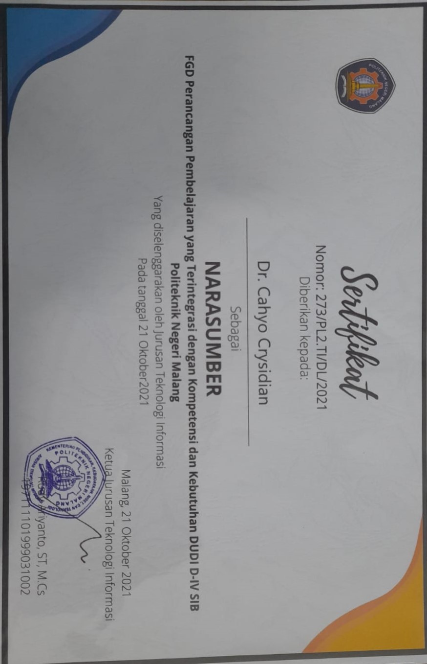 A curriculum evaluation of Business Information System Dept., POLINEMA was conducted by Dr. Cahyo Crysdian at Jurusan Teknologi Informasi on 21 October 2021. The activity was a part of university collaboration between UIN Maulana Malik Ibrahim Malang and POLINEMA in academic activity and community development program.