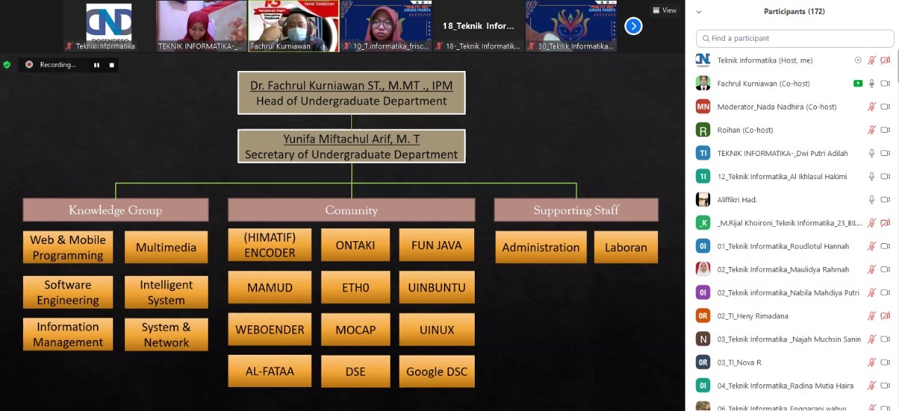 Informatics Engineering Department welcomes new students intake 2021 on Thursday, 02 September 2021. The event is “New Student Orientation” for both Undergraduate and Master Program. It consists of the introduction of the department to the new students, intoduction of student communities, group of research interests, and etc. The event takes place using conference meeting due to pandemi. This year, there are 172 new students enrolled in Undergraduate Program and 12 new students in Master Program at Computer Science Department