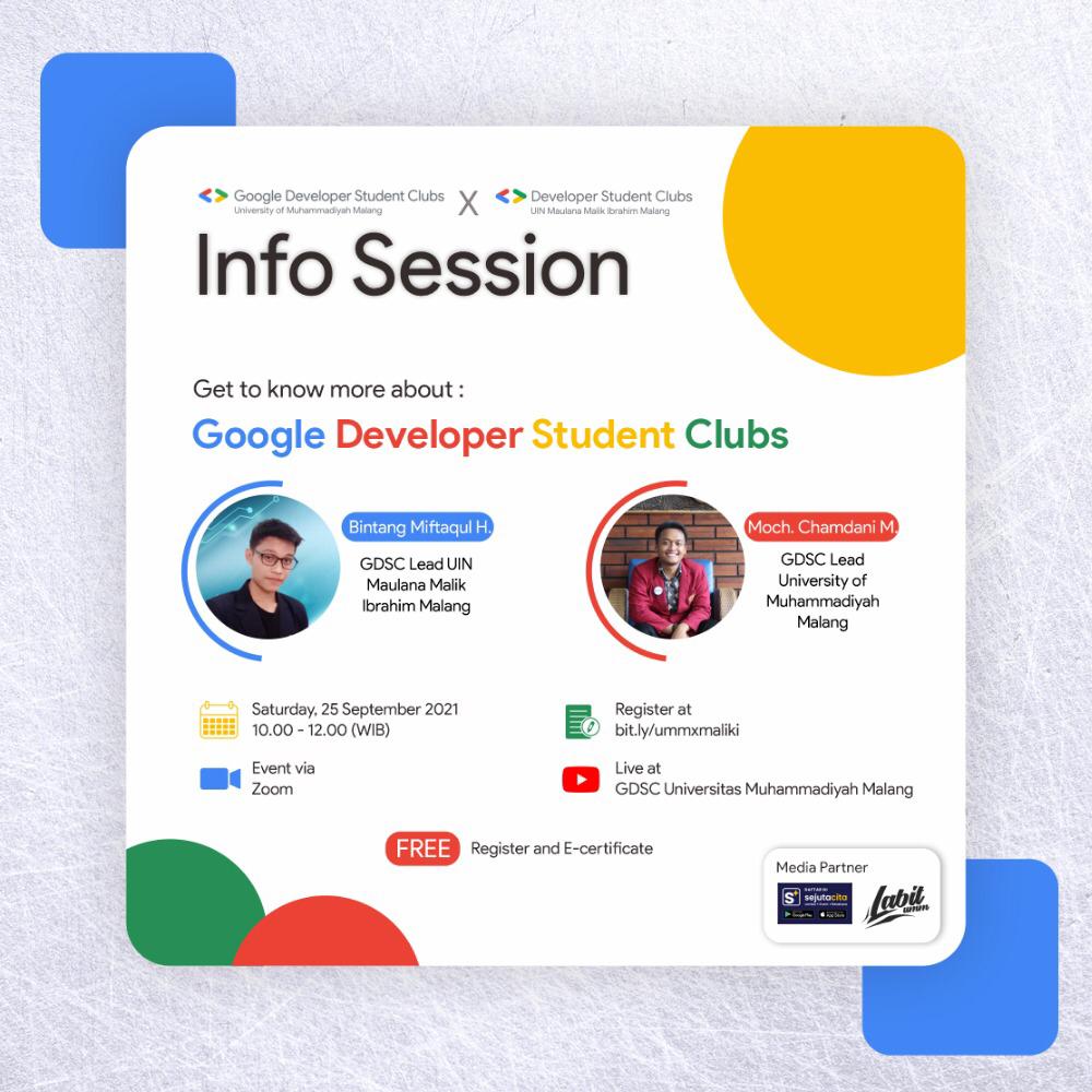Hello developers. GDSC UMM will collaborate with GDSC Maliki, in the upcoming info session event yaa. which of course with our cool speakers from GDSC Lead UMM kak Moch. Chamdani Mustaqim and GDSC Lead Maliki kak Bintang Miftaqul Huda. Here we will discuss what GDSC is, what technology and what