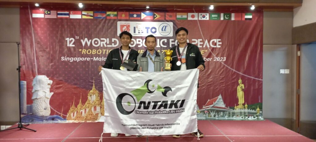 Congratulation to the achievement of Ontaki Robot Team informatic Engineering UIN Maliki Malang as Winner of Robo Sumo IOT 3 KG category on 12 World Robotic For Peace 2023 Singapore-Malaysia-Thailand Which was held from 22 – 28 October 2023. This competition is organized by Federation Of International Robotic Training And