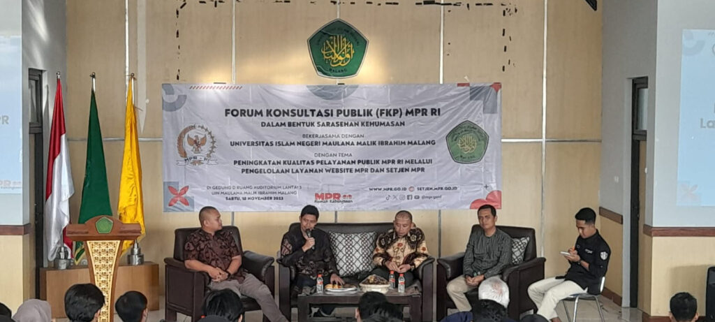 The Public Consultation Forum (FKP) together with the MPR RI in collaboration with the Informatics Engineering Study Program held a Public Consultation Forum (FKP) with the MPR RI on Saturday, 18 November 2023 in the Hall of Building D, UIN Campus, Malang City, East Java. This activity was attended by