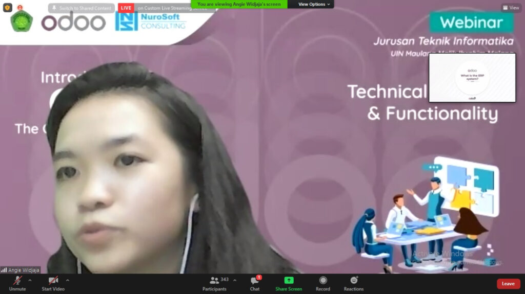There been held a guest lecture on Monday, 22 March 2021, with the theme of “Introduction to Odoo (Open Source Enterprise Resource Planning)” with the following agenda: Main speaker: Angie Widjaja (APAC Functional Consultant, Odoo) Our moderators: Shinta. D. Sutanto (Senior Business Analyst, Nurosoft Consulting) Material: What is Odoo? ERP