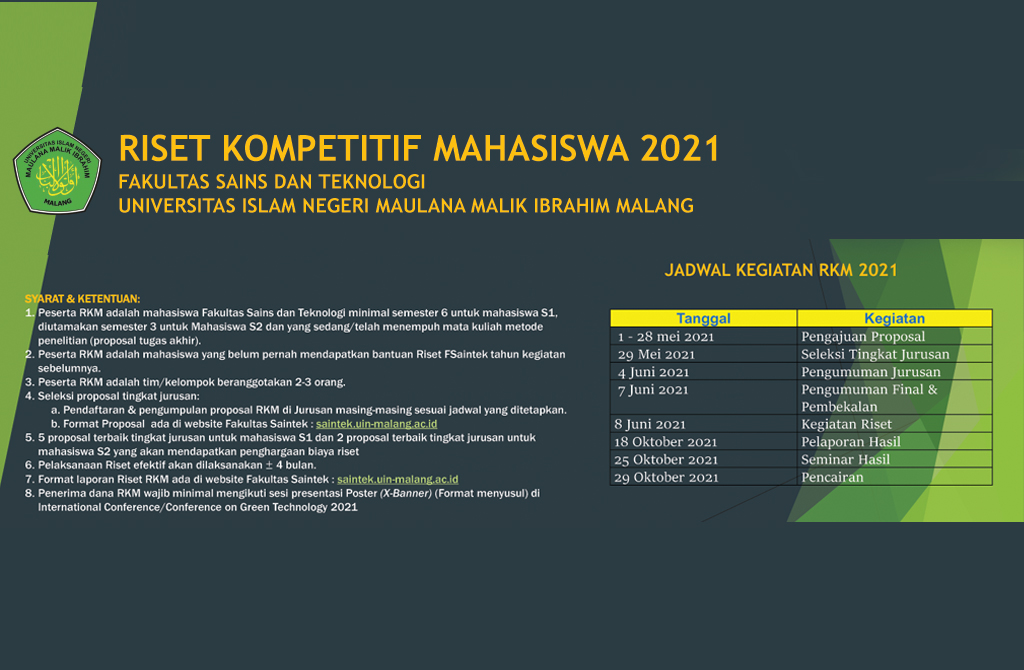 Student Competitive Research Program 2021 has been launched in May 2021, with the purpose is to provide research funding for selected topics. This program refers to https://mit.uin-malang.ac.id/riset-kompetitif-mahasiswa-2021.html. Undergraduate student research teams participate in this program are : No Team Leader Member 1 Member 2 Supervisor File Source Research Title 1