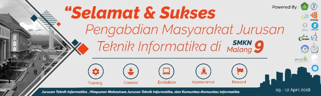 Kegiatan yang tidak kalah pentingnya di jurusan Teknik Informatika Fakultas Sains dan Teknologi UIN Maulana Malik Ibrahim Malang adalah kegiatan Pengabdian Masyarakat Jurusan Teknik Informatika yang akan dilaksanakan pada tanggal 9 – 12 April 2018. Kegiatan pengabdian masyarakat dilaksanakan di SMKN 9 Malang. Kegiatan tersebut meliputi beberapa bidang keahlian di SMK N 9 Malang diantaranya adalah bidang rekayasa perangkat lunak, jaringan komputer, animasi dan multimedia. Kegiatan tersebut melibatkan beberapa komunitas dan himpunan mahasiswa dijurusan Teknik Informatika.