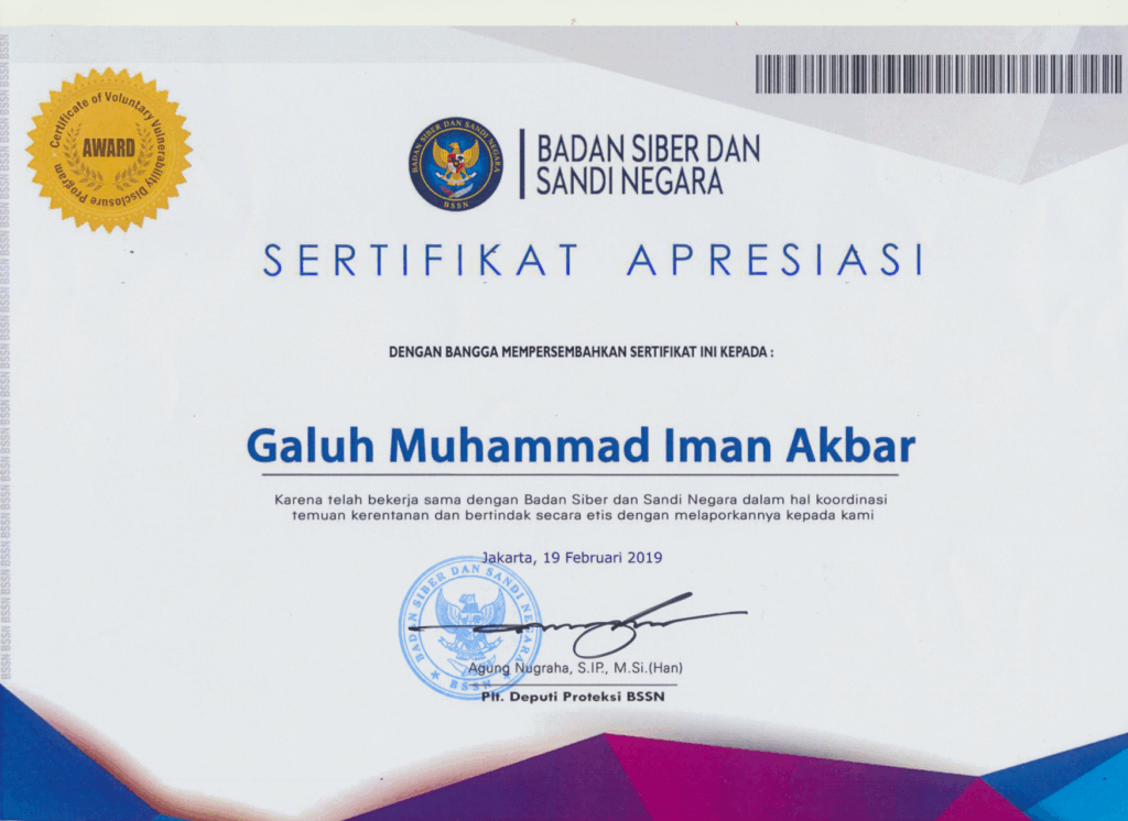 Congratulation for Galuh Muhammad Imam Akbar to receive Award Certificate of Voluntary Vulnerability Disclosure Program from Badan Siber dan Sandi Negara dated on 19 February 2019. The Award is obtained by his work to identify government web-based system vulnerability and to report it to the government cyber agency (Badan Siber dan Sandi Negara).