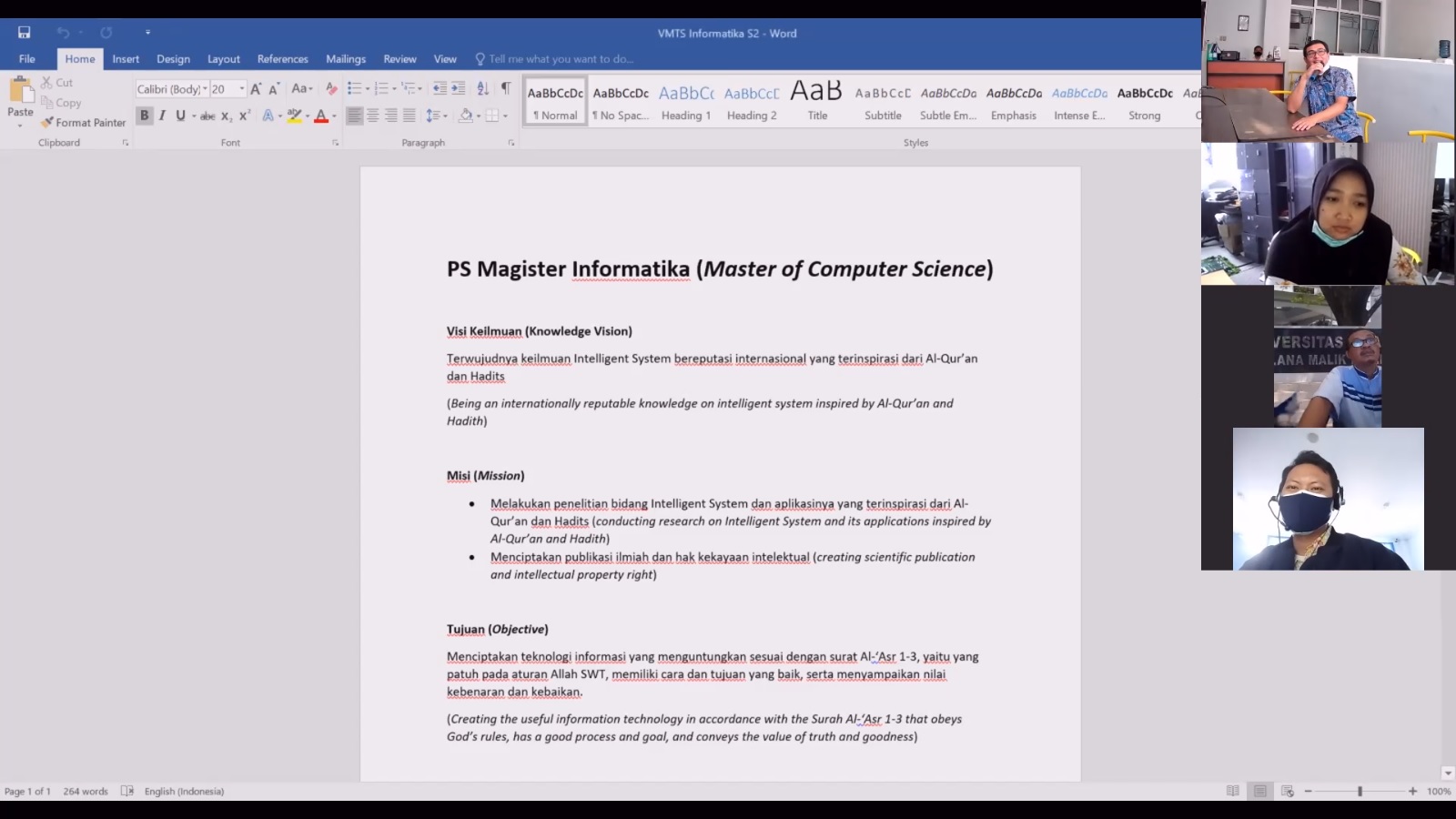 A meet-up to discuss the knowledge vision for Computer Science was held on 13 September 2021. The meeting was attended by the Dean of Faculty of Science and Technology, the representative of Quality Assurance Unit (Unit Penjaminan Mutu/UPM), the Head and the Secretary of Master Study, the lecturers, and the students of Computer Science. The result is as follow: