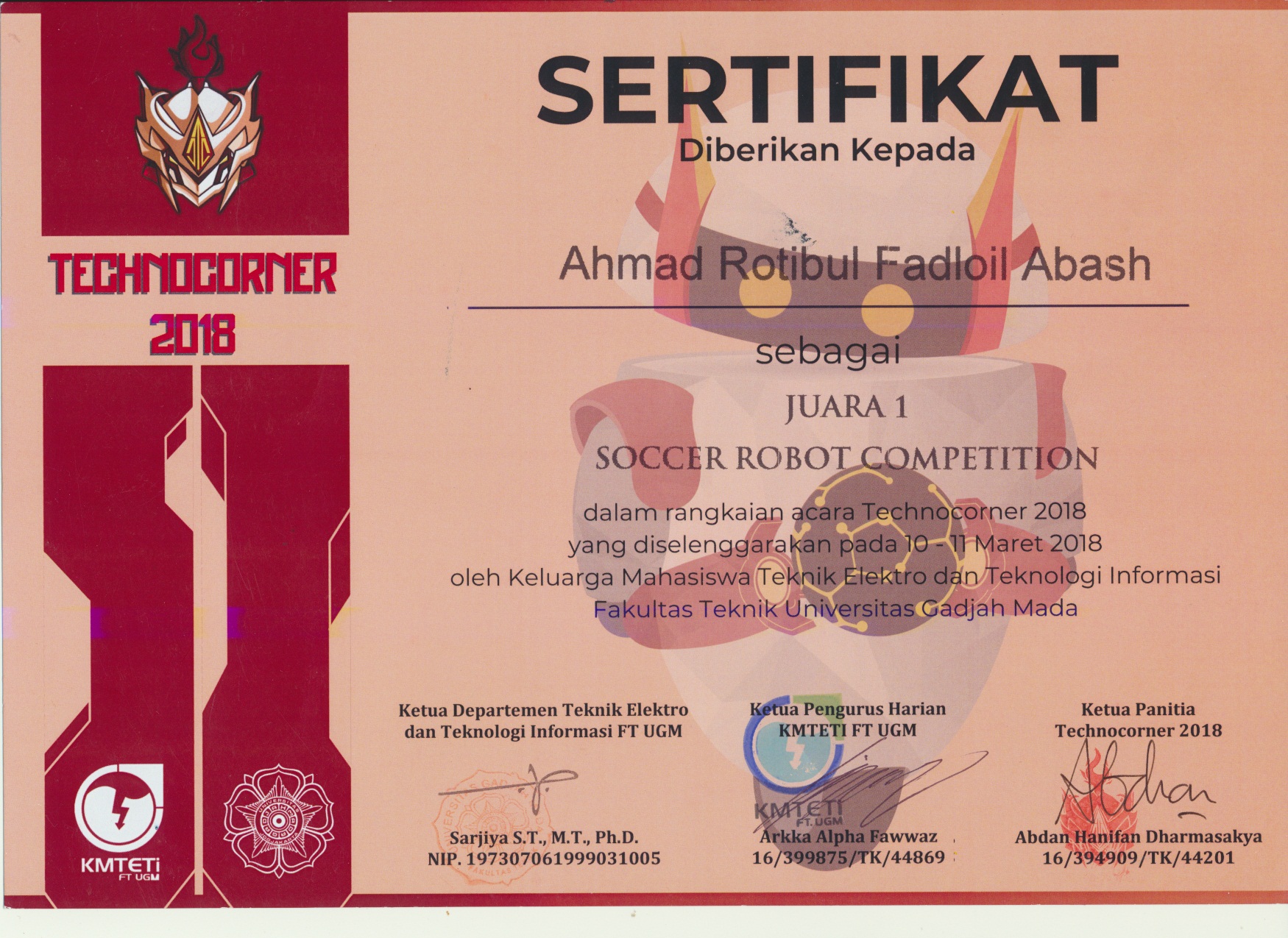 InformatikaNews-Komunitas Ontaki (Otomasi dan Robotika) Jurusan Teknik Informatika UIN Maulana Malik Ibrahim Malang kembali mengharumkan nama almamater kampus hijau.Tim Robotik UIN bertandang dalam kegiatan Technocorner yang diselenggarakan oleh Departemen Teknik Elektro dan Teknologi Informasi Fakultas Teknik Universitas Gadjah Mada (UGM). Tim Robotik berhasil menyabet juara 1 dalam cabang lomba Soccer Robot Competition, di Kantor Pusat Teknik Elektro UGM,Sabtu (10/3).