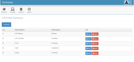 Aniss Fatul Fu’adah (17650024). Semester ganjil 2020/2021. Tempat PKL : Elecomp Software House. Eschedule merupakan sistem informasi manajemen peserta praktek kerja lapangan berbasis web yang digunakan untuk mengelola informasi peserta praktek kerja lapangan. Fitur-fitur yang terdapat dalam sistem manajemen praktek kerja lapangan ini meliputi manajemen peserta PKL, manajemen keahlian PKL,