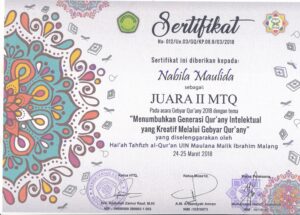 2. Nabila Maulida as 2nd Winner of Musabaqoh Tilawatil Qur’an, Gebyar Qur’ani 2018