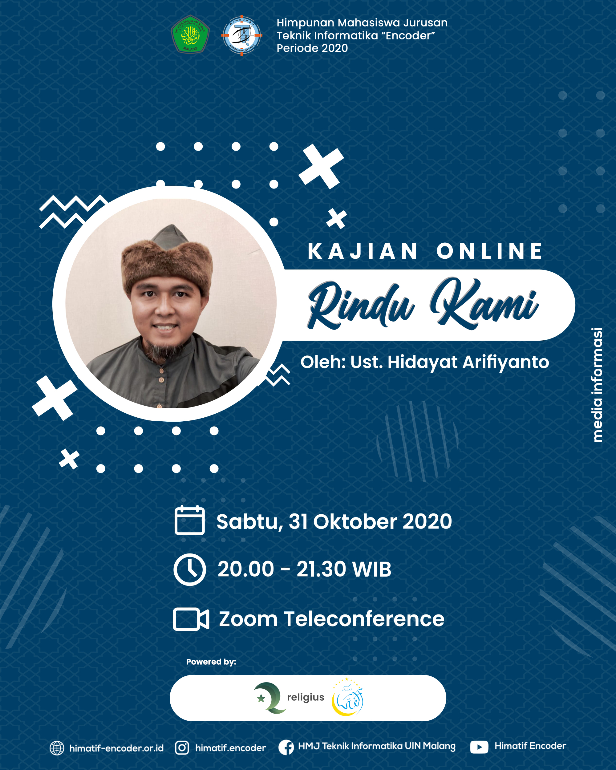 With the topic “Rindu Kami”, this event was held on Saturday, 31 October 2020 at 08.00 PM with the speaker, Ustadz Hidayat Arifianto and filled with the performance of Majlis Sholawat Al-Fataa. The event contained events directed at Muslims to know and love the Prophet Muhammad SAW more, in addition this event also aims to sharpen and deepen knowledge and all aspects related to the life of the Prophet Muhammad and everything that the Prophet left for His people. With the holding of this Kajian Islami, it is hoped that all of us can get results according to the expectations we mentioned earlier.
