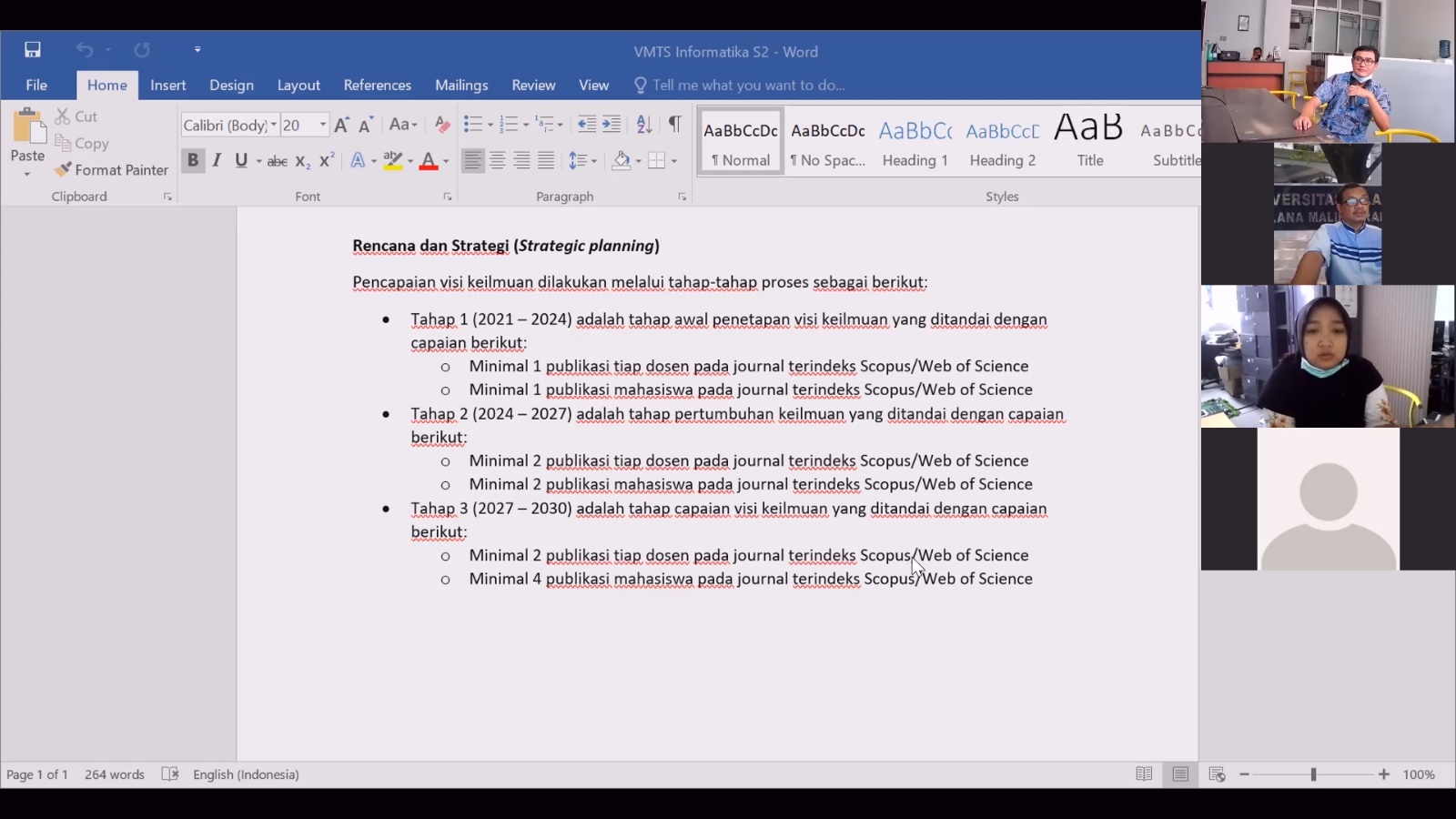 - Tahap 1 (2021 – 2024) adalah tahap awal penetapan visi keilmuan yang ditandai dengan capaian berikut: