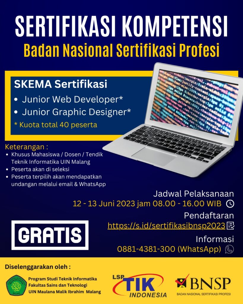 Program Studi Teknik Informatika UIN Malang Mengadakan Sertifikasi Kompetensi BNSP (Badan Nasional sertifikasi Profesi)
